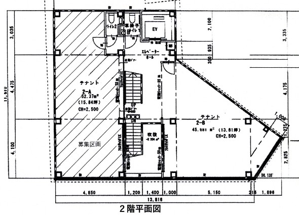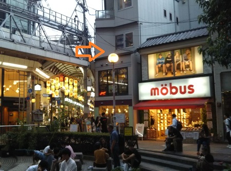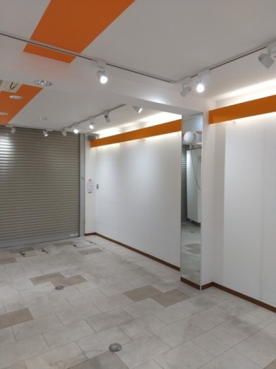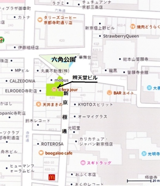 六角公園から見た「辨天堂ビル」(ビル側面/オレンジ矢印)